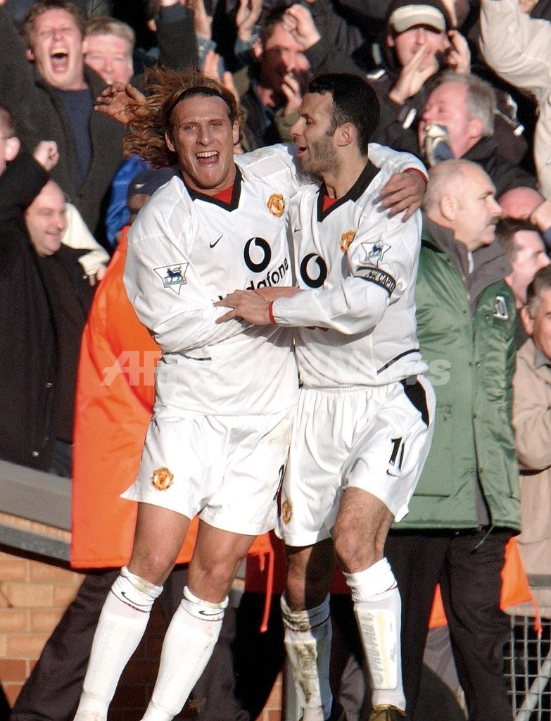 リバプール(Liverpool FC)との試合でチームメイトのディエゴ・フォルラン(Diego Forlan)と得点を喜ぶライアン・ギグス(2002年12月1日撮影)。(c)AFP/PAUL BARKER