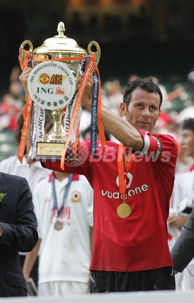 香港選抜と対戦したマンチェスター・ユナイテッド杯(Manchester United Cup)でトロフィーを掲げるライアン・ギグス(2005年7月23日撮影)。(c)AFP/MIKE CLARKE