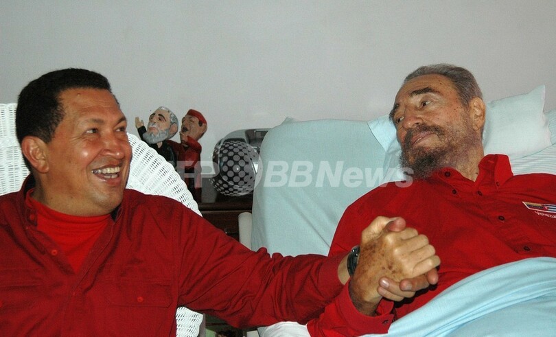 2000年3月8日、キューバからのボランティア受け入れの際に。キューバのフィデル・カストロ(Fidel Castro)前国家評議会議長はチャベス氏の重要な政治的盟友であり、チャベス氏はカストロ氏を「父」として慕った。