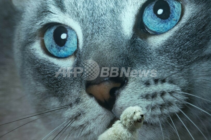 写真は、猫のポスターの前に座るラブラドール(2013年3月7日撮影)。(c)AFP/BEN STANSALL