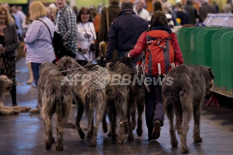 写真は、会場を歩く5匹のアイリッシュ・ウルフハウンドとその飼い主(2013年3月7日撮影)。(c)AFP/BEN STANSALL