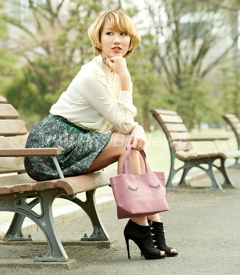 今日は、まつげをモチーフにしたトートバッグをコーディネート!膝丈のスカートを履いて、大人っぽく合わせるのがおすすめです。