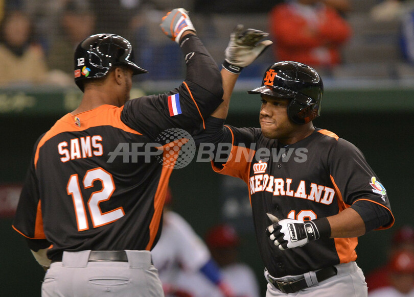 スポーツ 野球 オランダがキューバに快勝、WBC 2013年3月8日 18:18 発信地:東京 [ アジア・オセアニア 東京 ] このニュースをシェア ‹ › ❮ 14/15 ❯ 第3回ワールド・ベースボール・クラシック(2013 World Baseball Classic、WBC)は8日、東京で2次ラウンドの試合が行われ、オランダが6-2でキューバに勝利した。本塁打を放ち、チームメイトのカリアン・サムス(Kalian Sams、左)に祝福されるオランダのクルト・スミス(Curt Smith、2013年3月8日撮影)。(c)AFP/KAZUHIRO NOGI 画像作成中 ! 【3月8日 AFP】第3回ワールド・ベースボール・クラシック(2013 World Baseball Classic、WBC)は8日、東京で2次ラウンドの試合が行われ、オランダが6-2でキューバに勝利した。(c)AFP 野球 一覧へ> メディア・報道関係・法人の方向け 写真・動画 購入のお問合せ>