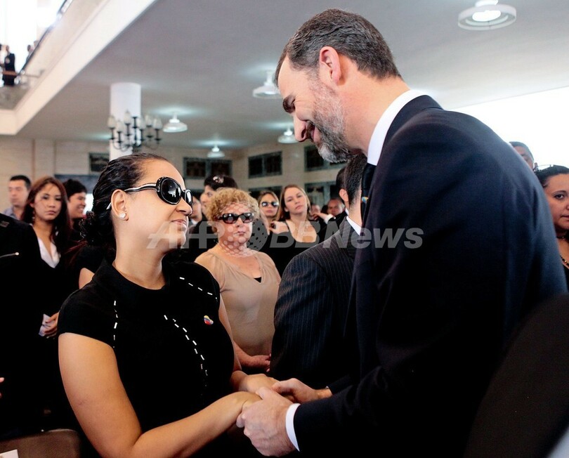 写真は、葬儀に参列し、大統領の娘ロサ・ビルヒニア(Rosa Virginia)さん(左)と言葉を交わすスペインのフェリペ皇太子(Prince of Asturias Felipe、2013年3月8日提供)。(c)AFP/PRESIDENCIA/MARCELO GARCIA