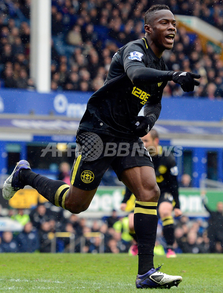 前半30分に先制点を挙げ歓喜するウィガンのマイノル・フィゲロア(Maynor Figueroa、2013年3月9日撮影)。(c)AFP/PAUL ELLIS