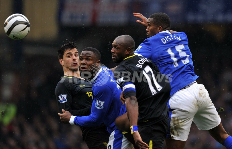 ボールを競り合うエバートンのヴィクトル・アニチェベ(Victor Anichebe、左から2人目)、シルヴァン・ディスタン(Sylvain Distin、右)とウィガンのパウル・ シャルナー(Paul Scharner、左)、エマーソン・ボイス(Emmerson Boyce、2013年3月9日撮影)。(c)AFP/PAUL ELLIS