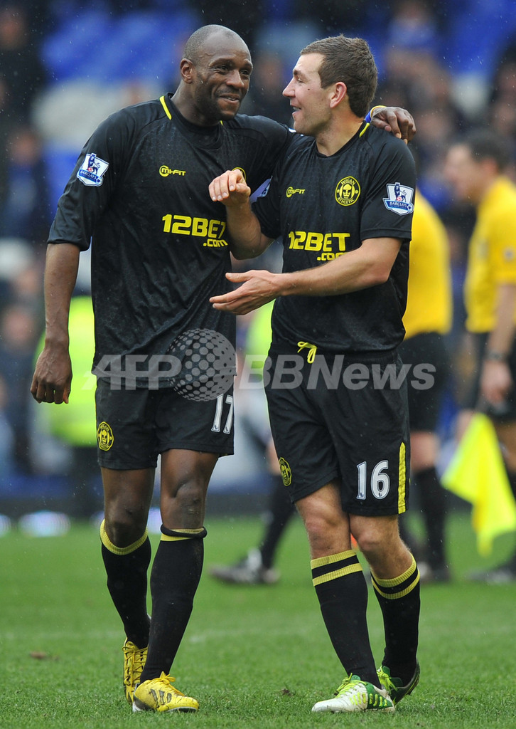 試合に勝利し喜ぶウィガンのエマーソン・ボイス(Emmerson Boyce、左)とジェームス・マッカーサー(James McArthur、2013年3月9日撮影)。(c)AFP/PAUL ELLIS