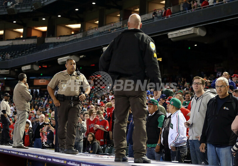 ダグアウトの上でスタンドを警戒する警官と警備員(2013年3月9日撮影)。(c)AFP/Getty Images/Christian Petersen