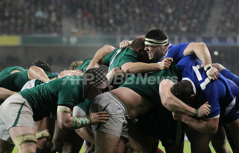 スクラムを組むアイルランド(左)とフランスの選手(2013年3月9日撮影)。(c)AFP/PETER MUHLY
