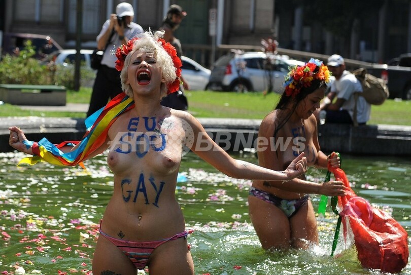 【3月10日 AFP】女性権利団体「FEMEN」のブラジルのメンバーらが9日、リオデジャネイロ(Rio de Janeiro)カンデラリア(Candelaria)教会の前にある噴水に入り、同性愛者を嫌悪する人たちへの抗議活動を行った。(c)AFP