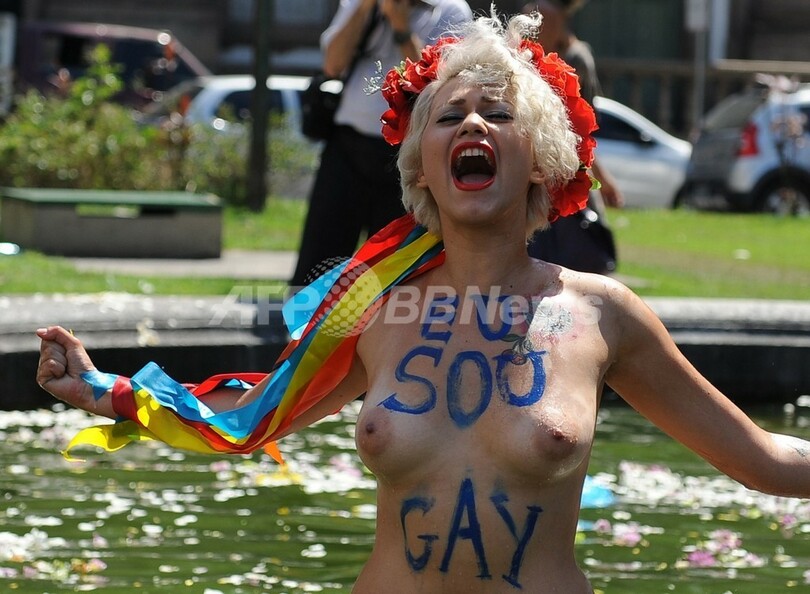 女性権利団体FEMEN、トップレスでホモフォビアに抗議