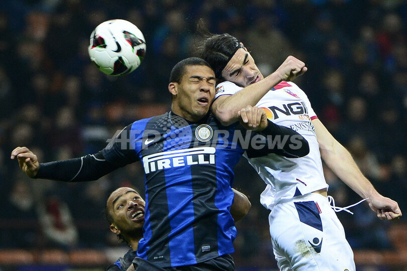 ヘディングでボールを競るボローニャのフェデリコ・マルティン・ロドリゲス(Federico Rodriguez、右)とインテルのフアン(Juan Guilherme Nunes Jesus、2013年3月10日撮影)。(c)AFP/OLIVIER MORIN