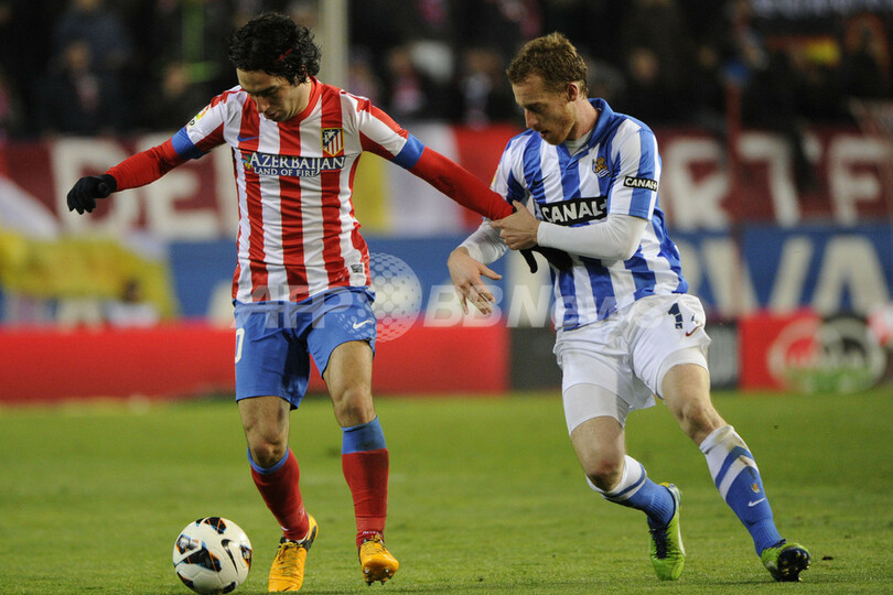 レアル・ソシエダのダビド・スルトゥサ(David Zurutuza 、右)とボールを競るアトレティコ・マドリードのアルダ・トゥラン(Arda Turan、2013年3月10日撮影)。(c)AFP/Pedro ARMESTRE