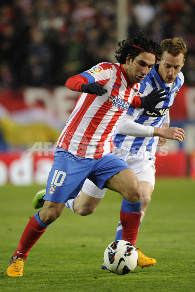 レアル・ソシエダのダビド・スルトゥサ(David Zurutuza 、奥)とボールを競るアトレティコ・マドリードのアルダ・トゥラン(Arda Turan、2013年3月10日撮影)。(c)AFP/Pedro ARMESTRE