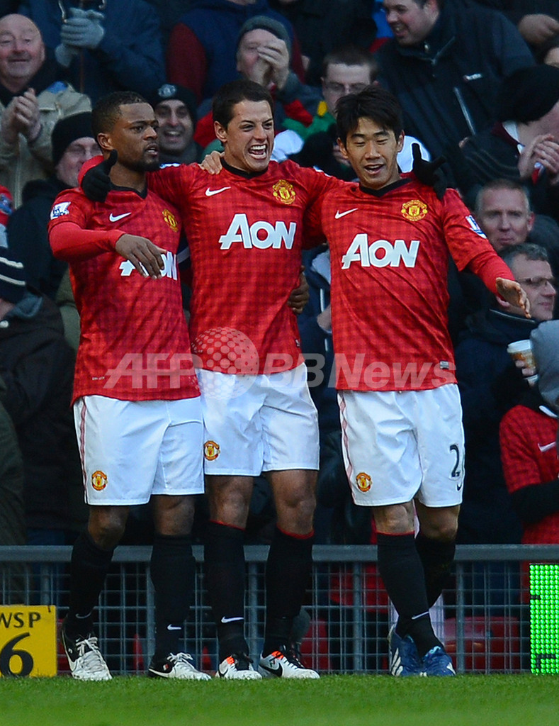 前半5分の先制点を喜び合うマンチェスター・ユナイテッドの(左から)パトリス・エヴラ(Patrice Evra)、得点を決めたハビエル・エルナンデス(Javier Hernandez)、香川真司(Shinji Kagawa、2013年3月10日撮影)。(c)AFP/ANDREW YATES