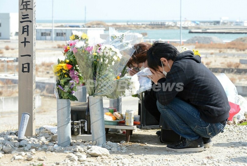 写真は、名取市閖上地区に設けられた祭壇の前で手を合わせる人々(2013年3月10日撮影)。(c)AFP/Toru YAMANAKA