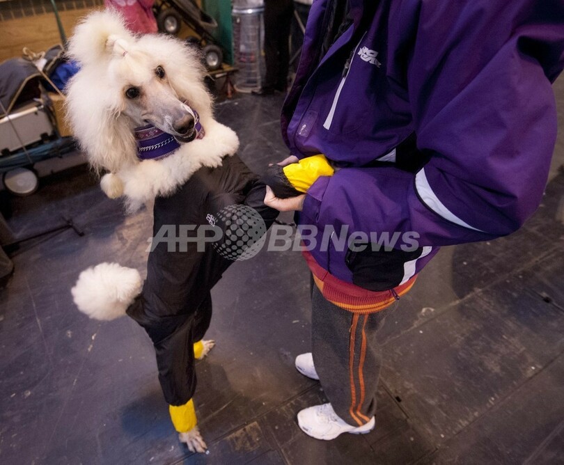 写真は、防水加工を施した洋服を着用するスタンダード・プードル(2013年3月8日撮影)。(c)AFP/BEN STANSALL