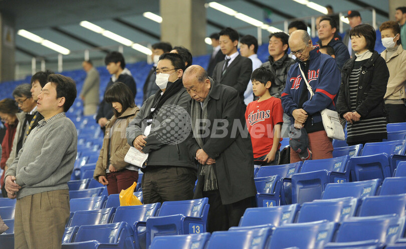 試合前、スタンドで東日本大震災の被災者へ黙とうをささげるファン(2013年3月11日撮影)。(c)AFP/KAZUHIRO NOGI