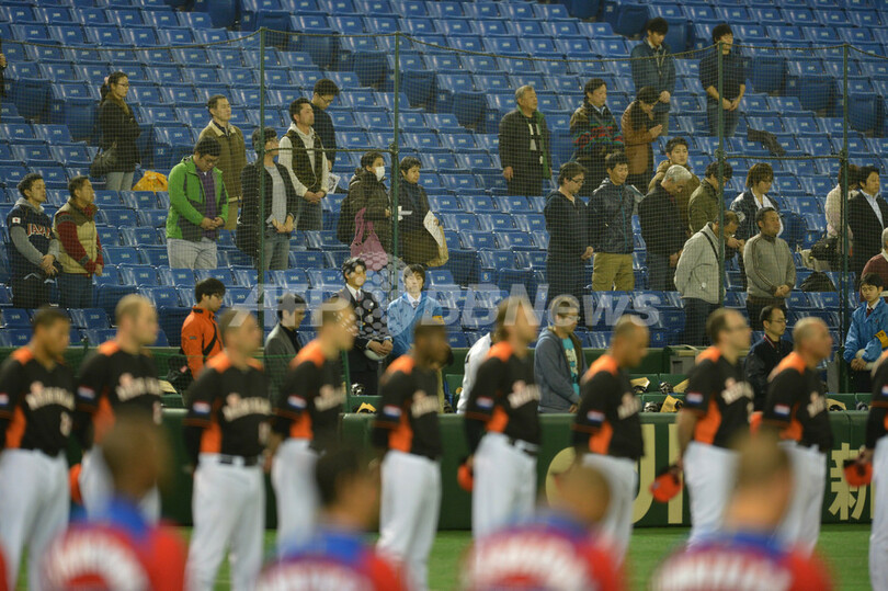 試合前、スタンドで東日本大震災の被災者へ黙とうをささげるファン(2013年3月11日撮影)。(c)AFP/KAZUHIRO NOGI