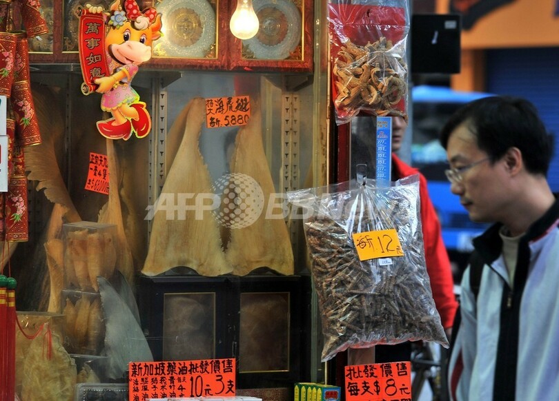 国連食糧農業機関(Food and Agriculture Organization、FAO)によると、サメの漁獲量は年間約1億匹に上り、その大半がヒレを目当てにした漁となっている。また乱獲が原因で、過去100年間で世界のサメの99%がすでにこの地球上から姿を消しているという。(c)AFP