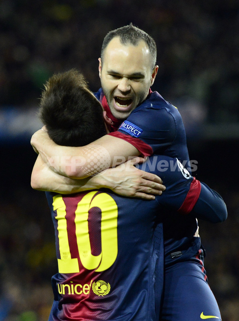 前半40分にチーム2得点目を挙げたリオネル・メッシ(Lionel Messi、左)を祝福するFCバルセロナのアンドレス・イニエスタ(Andres Iniesta、2013年3月12日撮影)。(c)AFP/JAVIER SORIANO
