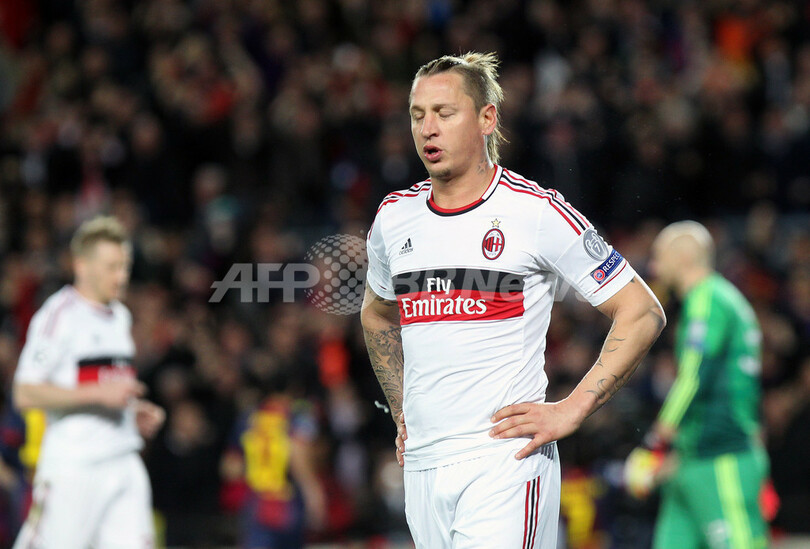 落胆した様子を見せるACミランのフィリップ・メクセス(Philippe Mexes、2013年3月12日撮影)。(c)AFP/QUIQUE GARCIA