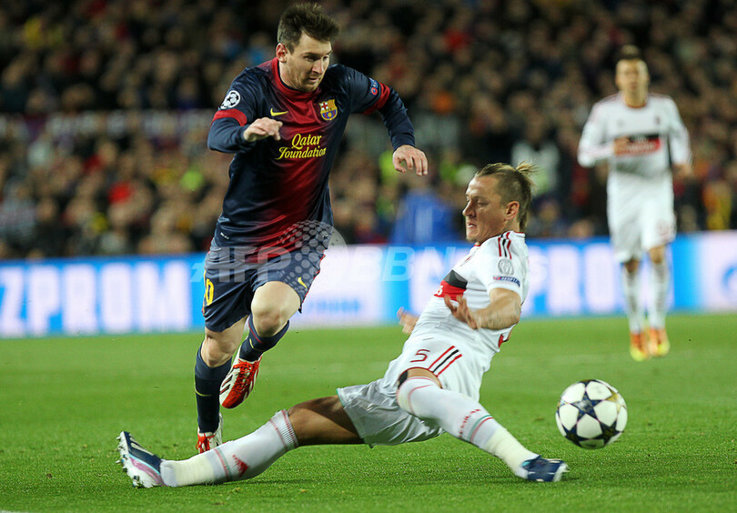 ACミランのフィリップ・メクセス(Philippe Mexes、右)のスライディングタックルを避けるFCバルセロナのリオネル・メッシ(Lionel Messi、2013年3月12日撮影)。(c)AFP/QUIQUE GARCIA