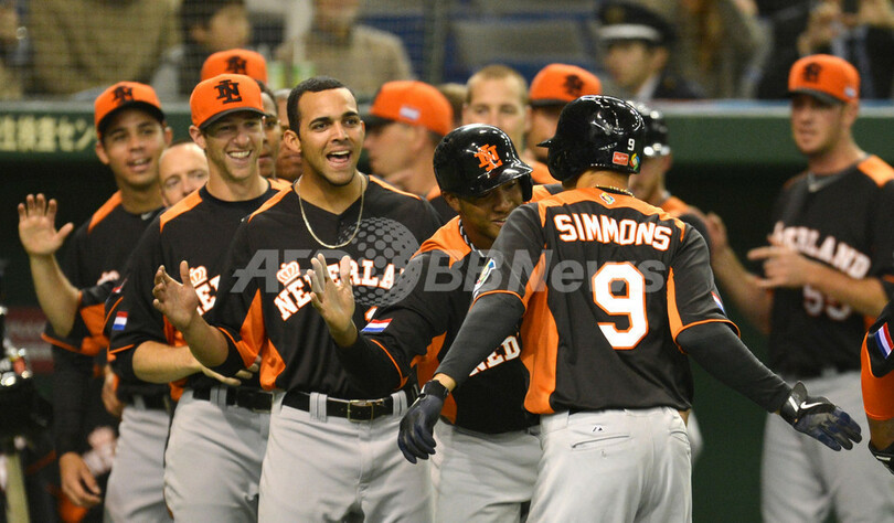 1回に先制のソロ本塁打を放ち、チームメイトの祝福を受けるオランダのアンドレルトン・シモンズ (Andrelton Simmons、右、2013年3月12日撮影)。(c)AFP/KAZUHIRO NOGI