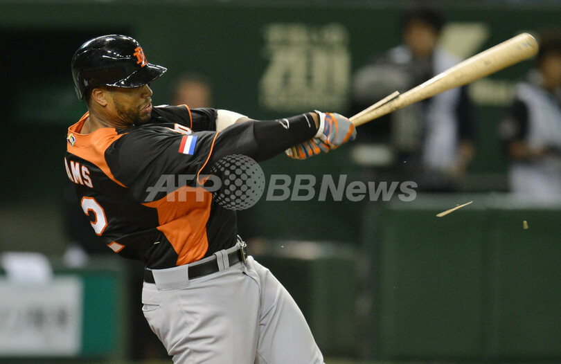 8回にバットを折りながら適時打を放つオランダのカリアン・サムス(Kalian Sams、2013年3月12日撮影)。(c)AFP/KAZUHIRO NOGI