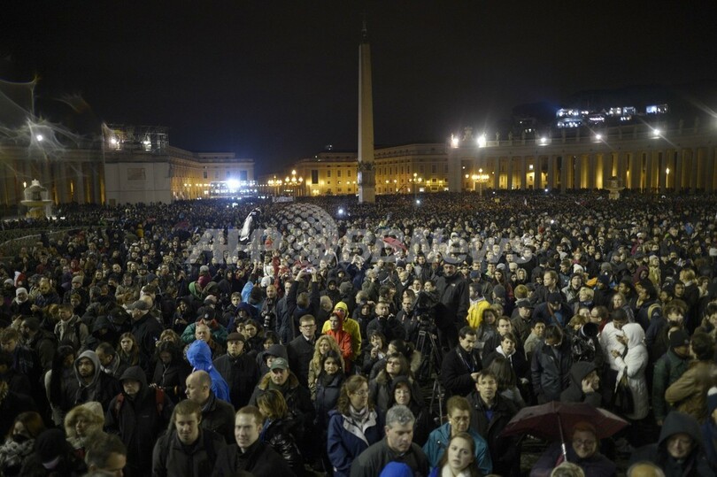 煙突から黒い煙が吹き出すと、サンピエトロ広場(St Peter's Square)に集まった数万人の群衆は興奮と落胆の渦に包まれた(2013年3月12日撮影)。(c)AFP/JOHANNES EISELE
