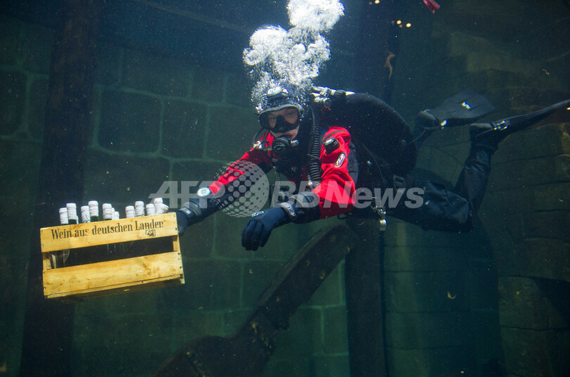 実はこれ、ワインの販促イベント。バルト海(Baltic Sea)に面した独メクレンブルク・フォアポンメルン(Mecklenburg-Western Pomerania)州では、シュトラールズントなど商人・都市の連合体「ハンザ同盟」に加盟している6都市に、地元で醸造したワインをバルト海の海底に「貯蔵」して熟成させる伝統がある。ちなみに、ある企業は今年1月に6つの木枠に収めたワイン600本をバルト海に沈めたというが、その場所は秘密だそうだ。(c)AFP