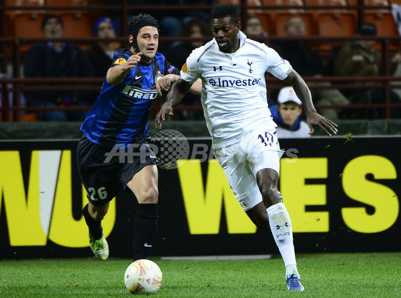 ボールを競るインテルのクリスティアン・キヴ(Cristian Chivu)とトッテナム・ホットスパーのエマヌエル・アデバヨール(Emmanuel Adebayor、2013年3月14日撮影)。(c)AFP/OLIVIER MORIN