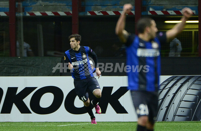 対するインテルは、延長後半5分にカッサーノのクロスからリカルド・アルバレス(Ricardo Alvarez)が得点を挙げたものの、準々決勝進出には届かなかった。(c)AFP/Barnaby Chesterman