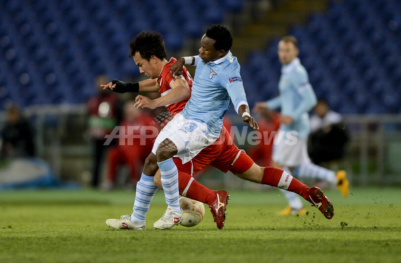 ラツィオのオゲニー・オナジ(Ogenyi Onazi、手前)とボールを競るシュツットガルトの岡崎慎司(Shinji Okazaki、、2013年3月14日撮影)。(c)AFP/ANDREAS SOLARO