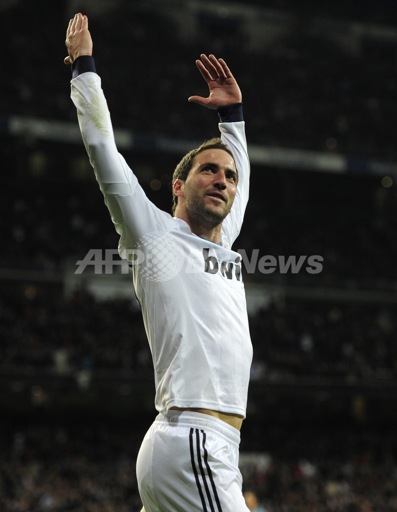 得点を決め歓喜するレアル・マドリードのゴンサロ・イグアイン(Gonzalo Higuain、2013年3月16日撮影)。(c)AFP/DANI POZO
