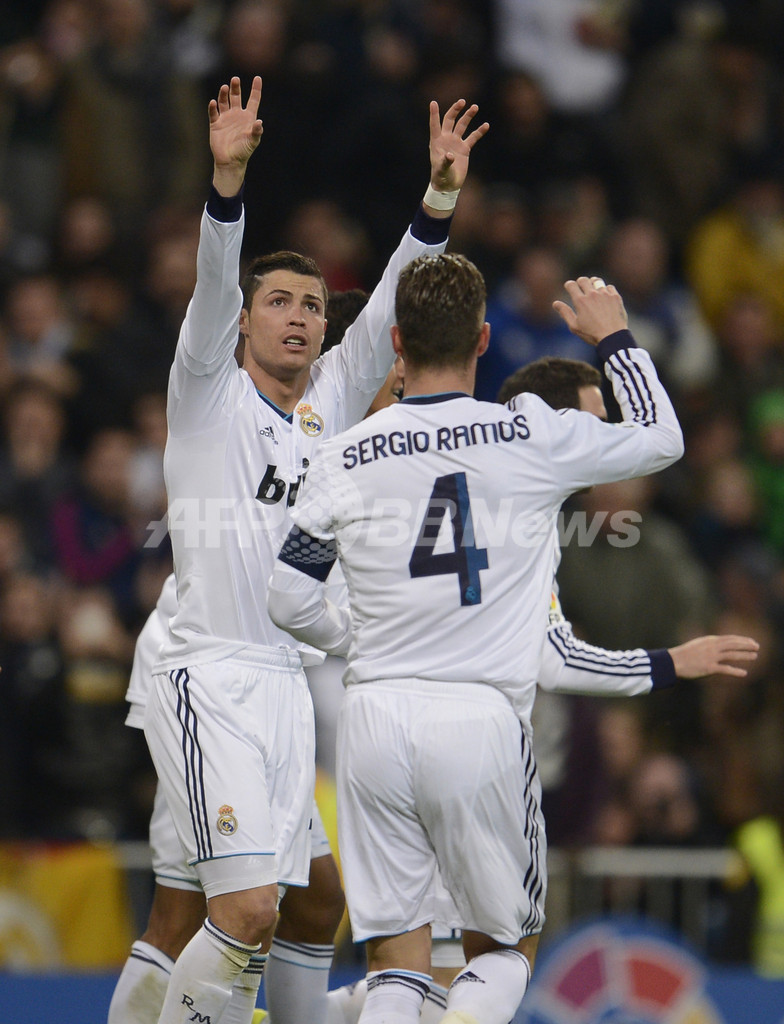 後半7分に同点ゴールを決め喜ぶレアル・マドリードのクリスティアーノ・ロナウド(Cristiano Ronaldo、左、2013年3月16日撮影)。(c)AFP/DANI POZO