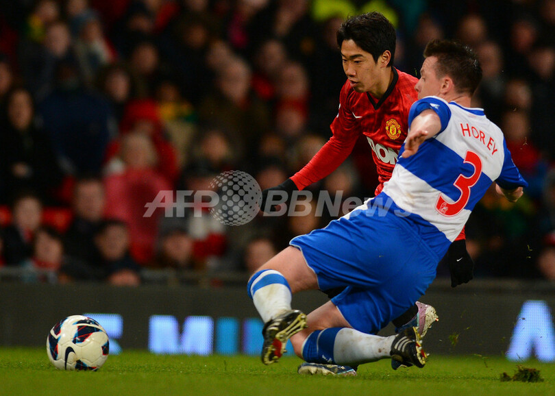 レディングのニッキー・ショーリー(Nicky Shorey、手前)とボールを競るマンチェスター・ユナイテッドの香川真司(Shinji Kagawa、2013年3月16日撮影)。(c)AFP/ANDREW YATES