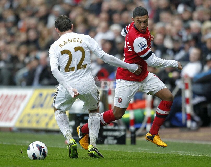 スウォンジー・シティのアンヘル・ランゲル(Angel Rangel、左)とボールを競るアーセナルのアレックス・オックスレイド・チェンバレン(Alex Oxlade-Chamberlain、2013年3月16日撮影)。(c)AFP/Ian KINGTON