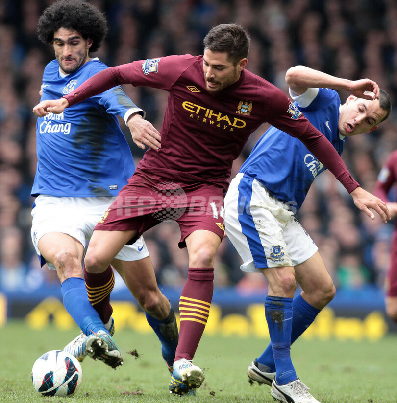 エバートンのマルアン・フェライニ(Marouane Fellaini、左)、レオン・オスマン(Leon Osman、右)とボールを競るマンチェスター・シティのハビ・ガルシア(Javi Garcia、2013年3月16日撮影)。(c)AFP/LINDSEY PARNABY