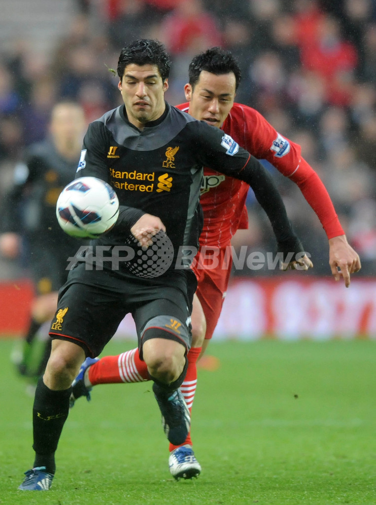 リバプールのルイス・スアレス(Luis Suarez、手前)とボールを競るサウサンプトンの吉田麻也(Maya Yoshida、2013年3月16日撮影)。(c)AFP/Olly GREENWOOD