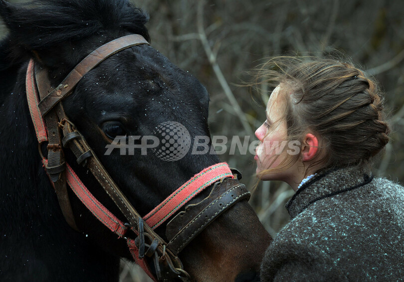写真は、馬とともにパレードに参加したハンガリー系住民の女性(2013年3月15日撮影)。(c)AFP/DANIEL MIHAILESCU