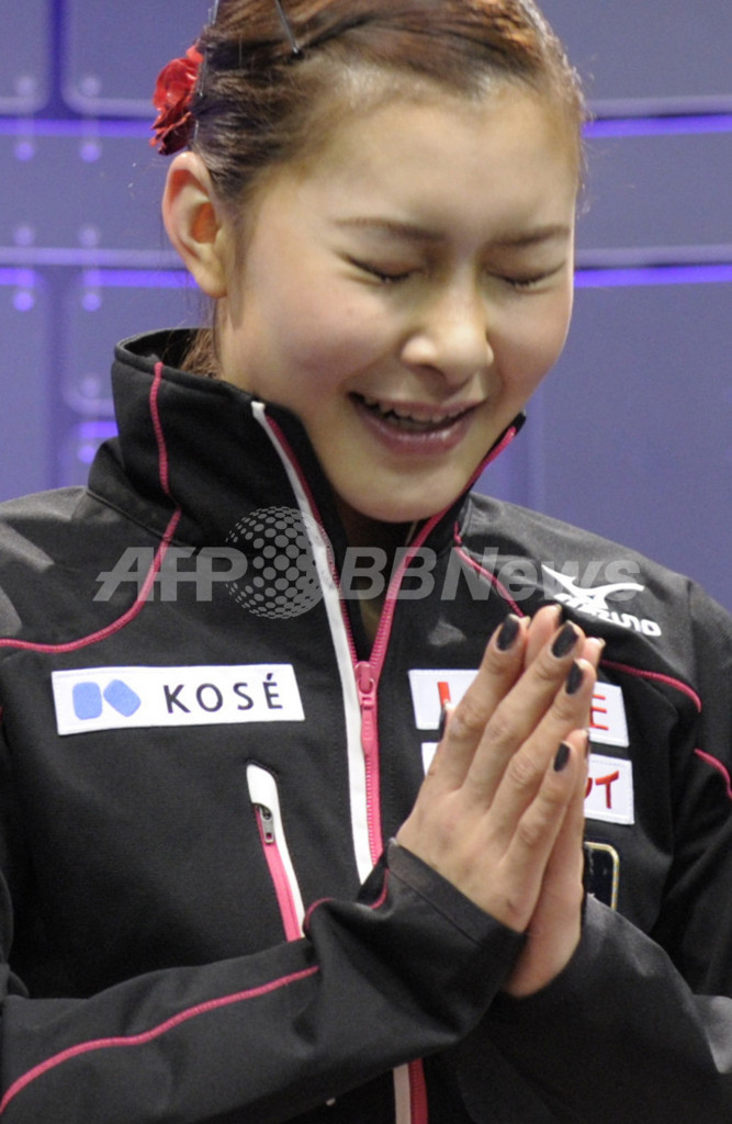 キスアンドクライで手を合わせる村上佳菜子(Kanako Murakami、2013年3月16日撮影)。(c)AFP/Brendan SMIALOWSKI