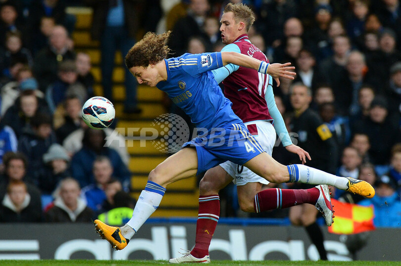 ウェストハムのジャック・コリゾン(Jack Collison、右)とボールを競るチェルシーのダビド・ルイス(David Luiz、2013年3月17日撮影)。(c)AFP/BEN STANSALL