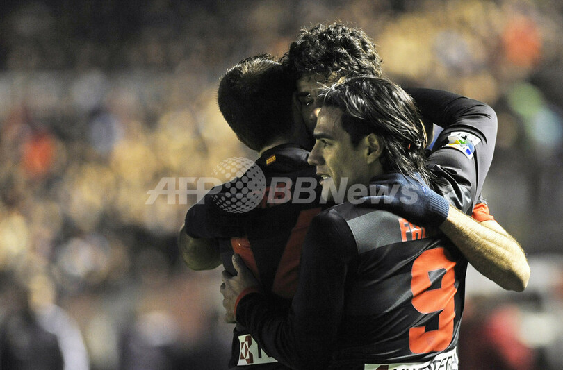 得点を決めたジエゴ・コスタ(Diego da Silva Costa、奥)を祝福するアトレティコ・マドリードのラダメル・ファルカオ・ガルシア(Radamel Falcao Garcia、手前、2013年3月17日撮影)。(c)AFP/RAFA RIVAS