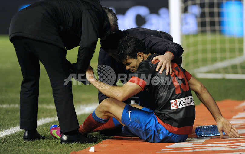 負傷し座り込むアトレティコ・マドリードのジエゴ・コスタ(Diego da Silva Costa、2013年3月17日撮影)。(c)AFP/RAFA RIVAS