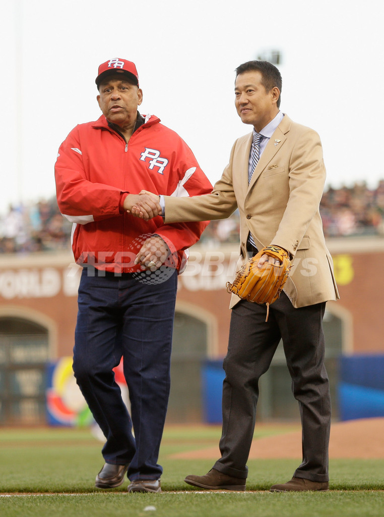 始球式を終え、オーランド・セペダ(Orlando Cepeda、左)氏と握手を交わす原辰徳(Tatsunori Hara)氏(2013年3月17日撮影)。(c)AFP/Getty Images/Ezra Shaw