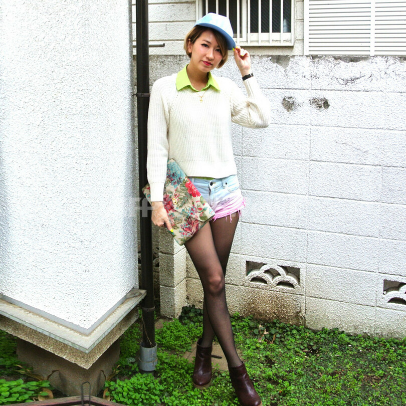 今日はスカーティッシュのショートパンツをコーディネートしました。水色とピンクのグラデーションが珍しくて一目惚れしたアイテム。ヘビロテ中のH&Mの白ニットに、黄緑色のシャツを合わせてPOPに!