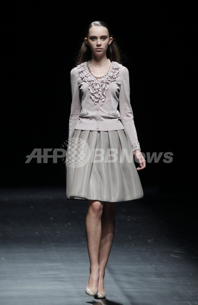テーマは、「イスタンブール~シルクロード」。洋服を通して、自分自身に向き合う、今を生きる凛とした女性へ贈るコレクションは、襟や裾、ポケットなどディテールのクリスタル使いやファー素材の取り入れ方が、女性の心を鷲掴みにする。バルーンスカートやフレアスカートなど、柔らかくて、フワフワしたシルエットがかわいい。ロングネックレスなどアクセサリーでエキゾチックな雰囲気を醸し出す。ショー後半には、シルクロードを彷彿っせる真っ赤なドレスやワンピースなどがずらりと並んだ。【岩田奈那】(c)AFPBB News