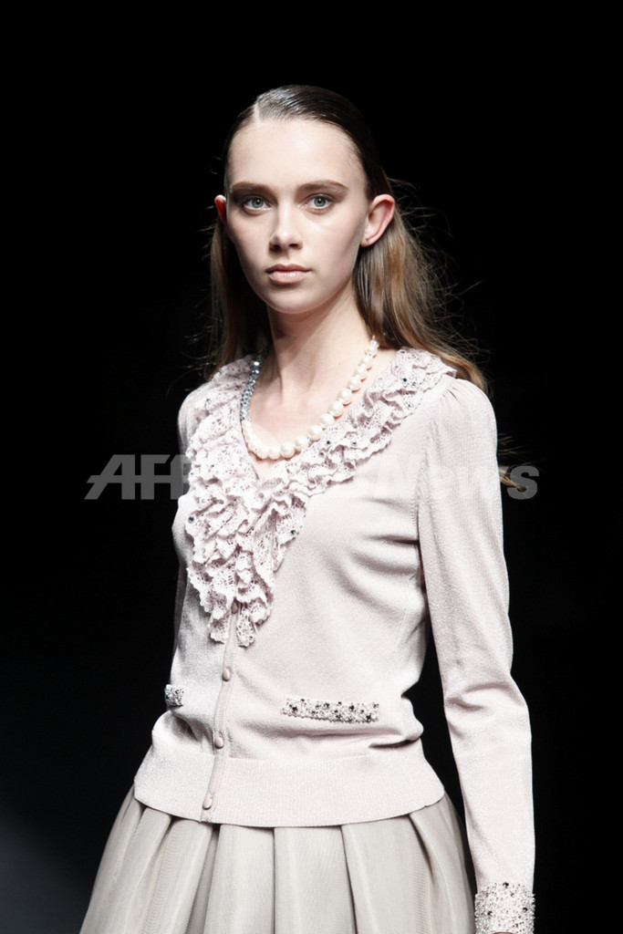 テーマは、「イスタンブール~シルクロード」。洋服を通して、自分自身に向き合う、今を生きる凛とした女性へ贈るコレクションは、襟や裾、ポケットなどディテールのクリスタル使いやファー素材の取り入れ方が、女性の心を鷲掴みにする。バルーンスカートやフレアスカートなど、柔らかくて、フワフワしたシルエットがかわいい。ロングネックレスなどアクセサリーでエキゾチックな雰囲気を醸し出す。ショー後半には、シルクロードを彷彿っせる真っ赤なドレスやワンピースなどがずらりと並んだ。【岩田奈那】(c)AFPBB News