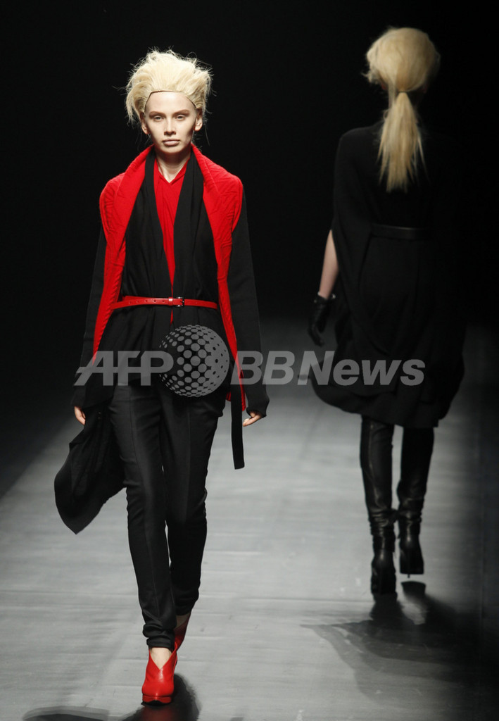 「“Anima”男性の無意識の中にある女性像、女性性」をテーマに展開した今シーズンのヤストシ エズミ。男性デザイナーの視点だからこそ形にできた、フェミニンさなかにもマスキュリンを含んだ仕上がり。曲線と直線、赤と黒、強さと弱さ。相反する要素をジャケットやパンツ、ドレープを手繰り寄せたワンピースなどに落とし込んだ。【岩田奈那】(c)AFPBB News